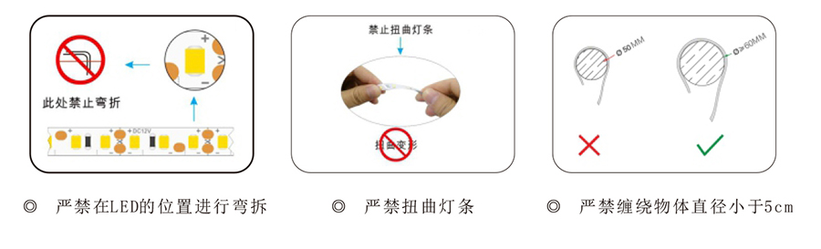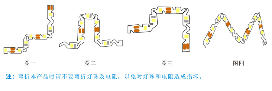 3、弯折软灯带时严禁弯折灯珠及电阻,以免损坏灯珠及电阻。