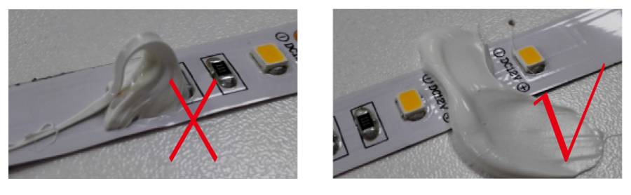 11、永久固定灯带时,需要进行分段打玻璃胶或免钉胶(建议距离5-8公分)注意不要把胶水打到灯珠上,否则会导致灯珠发光颜色不一致。