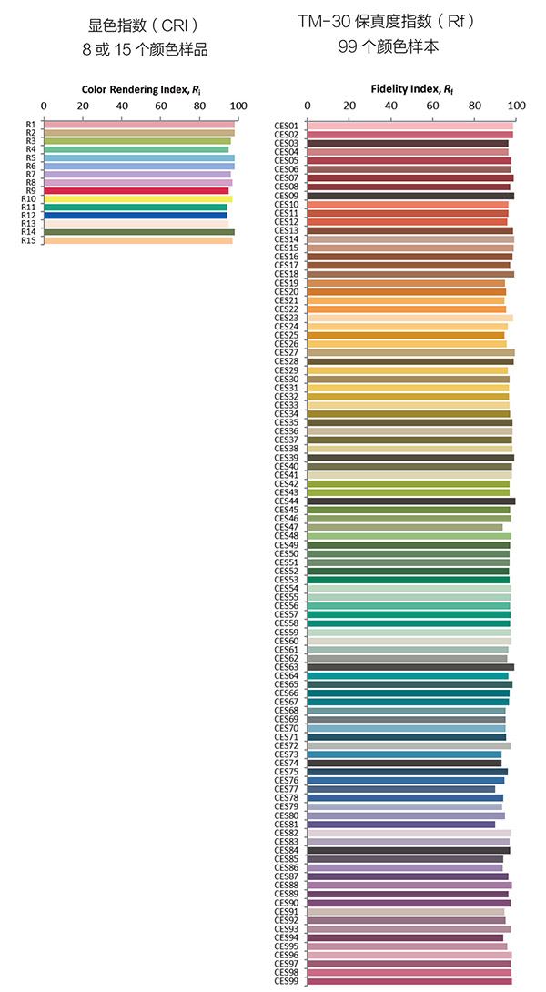 TM-30是一种新的改进的IES方法,用于表征白光源的显色能力。虽然CRI和扩展CRI分别使用8和15个颜色样本,但它们并不一定代表我们在现实中会遇到的实际颜色。另一方面,在TM-30下开发的新保真度指数(Rf)在其计算中使用了99个颜色样本,为描述光源忠实地呈现颜色的能力提供了更具统计代表性和更可靠的度量。根据CRI,TM-30标准下Rf的极佳得分为100。
